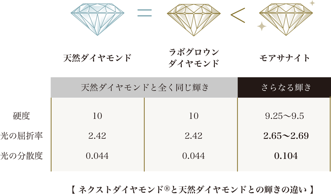 モアサナイトはダイヤモンドに次ぐ硬度を持ち、割れや欠けに対する強度(耐久性)はダイヤモンドよりも強く、ダイヤモンドを超える光の屈折率と光の分散度(光の広がり)を誇ります。モアサナイトの光の分散度は天然ダイヤモンドの2.5倍、世界で一番輝く宝石なのです。